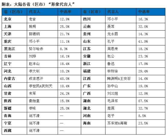 网上曾有过一次“中国各省形象代言人”的大型调查。经网友投票,结果发现大众心目中能为自己家乡代言的人物,涵盖古代圣贤、文人义士、地方父母官、伟大领袖、明星等,真可谓“古今一锅烩,文娱一家亲”,称得上不拘一格。